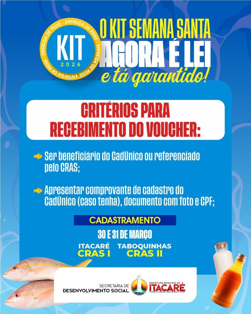 A solidariedade agora é um compromisso permanente em Itacaré. Com a sanção da Lei Municipal nº 500, de 18 de março de 2026, a entrega do Kit Semana Santa passa a ser garantida todos os anos às famílias que mais precisam, fortalecendo as políticas públicas de assistência social no município.