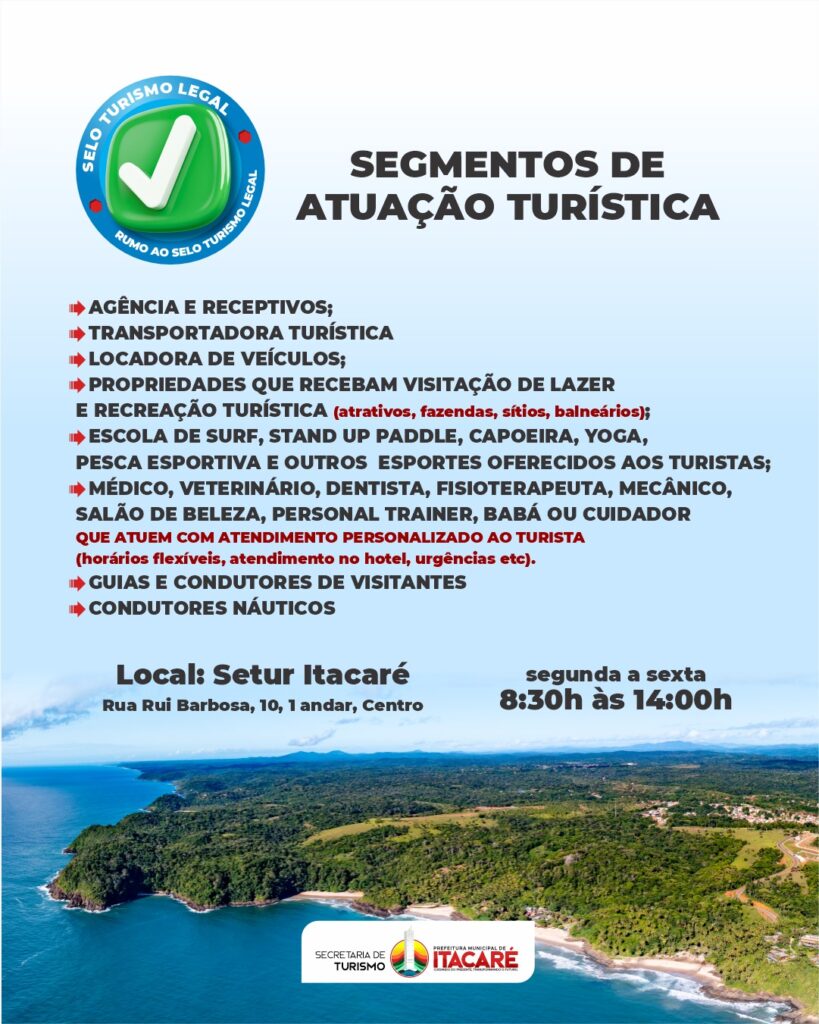 O atendimento acontece na sede da Secretaria de Turismo de Itacaré, de segunda a sexta-feira, das 8h30 às 13h30. Os interessados devem comparecer com documentos pessoais, documentos gerais empresa e quando aplicável.