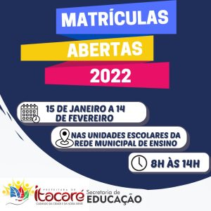 Últimas Notícias Prefeitura de Itacaré realiza até o dia 14 as matrículas da rede municipal Ler mais fevereiro 7, 2022