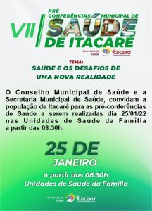 Últimas Notícias Itacaré realizará no próximo dia 25 Pré-Conferências Municipais de Saúde Ler mais janeiro 22, 2022