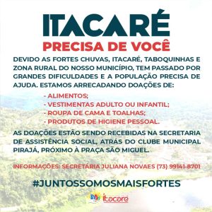 Últimas Notícias Prefeitura de Itacaré continua campanha para ajudar os desalojados das chuvas Ler mais dezembro 28, 2021