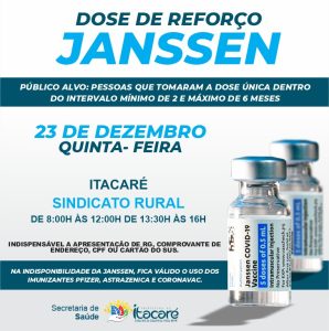 Últimas Notícias Itacaré aplica nesta quinta-feira dose de reforço da vacina Janssen Ler mais dezembro 21, 2021
