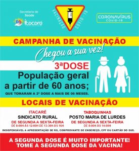 Últimas Notícias Itacaré aplica a 3ª dose para acima de 60 anos e imunossuprimidos Ler mais outubro 11, 2021