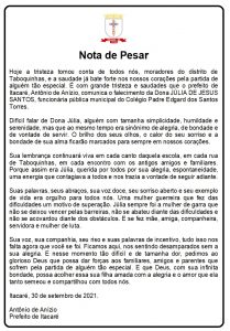 Últimas Notícias Nota de Pesar pelo falecimento da Dona JÚLIA DE JESUS SANTOS Ler mais setembro 30, 2021
